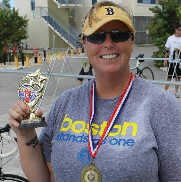 Yeahhh….I still hate running. I may be slow but at least I can’t run for very long. My friend Michael was in transition waiting for his wife to finish. yeah, she ROCKED it! and he started playing the Rocky theme on his iPad which made me laugh. inwardly. outwardly I’m sure my face looked like I was fighting off a heart attack while sucking on a lemon. I put my running shoes on, grabbed my visor and my water bottle and took off like…..a hippo. and an injured one at that. The earlier pop I felt in my knee while clipping in was not to be ignored one moment longer. I sucked it up, drank some water, ate a couple chews and hobbled off. I tried running a bit and my knee was like “really? that’s hilarious. yeah, not happening sister”. The bastard. I fought off tears and just looked at my arm. and the mantra kinda worked. It was fun. not at that moment, but other parts, and I knew it would be fun after the finish. Mostly cause there would be beer.  It wasn’t until mile 2 that I was able to pick up the pace a bit. And like a hallucination, my friend Jenna suddenly appeared on the US 1 stretch to hang with me. It was a really good boost. She made me laugh and I was a bit less tense. Like from “being held hostage at a bank” tense downgraded to “being the robber at a bank” excited tense. At the water station my good friend Scooter Guy (you know, the one that always YELLS “Last one, this is the last biker/runner”) had saved me a cold bottle of water. Why did he have to save it? well, because the water station was dismantled by the time I hobbled in. I dumped the whole thing over my head and down my tank trying to bring my temp down as taught to me by Brad (no ice available for the cooler though). Jenna left me and I headed for mile 3. I was able to run a bit more and felt better than I had since I left T2. I actually felt like I was racing. at times. I forgot about my knee pain. Mostly because everything else hurt just as much. I just carried on. I looked at my arm which at this point read ” his is F N!”. As I rounded the corner to the finish line passing all of the people that had finished, showered and had gone to breakfast, I felt pretty good and for the first time, ran across the finish line. Or stumbled. I’m gonna go with ran though.