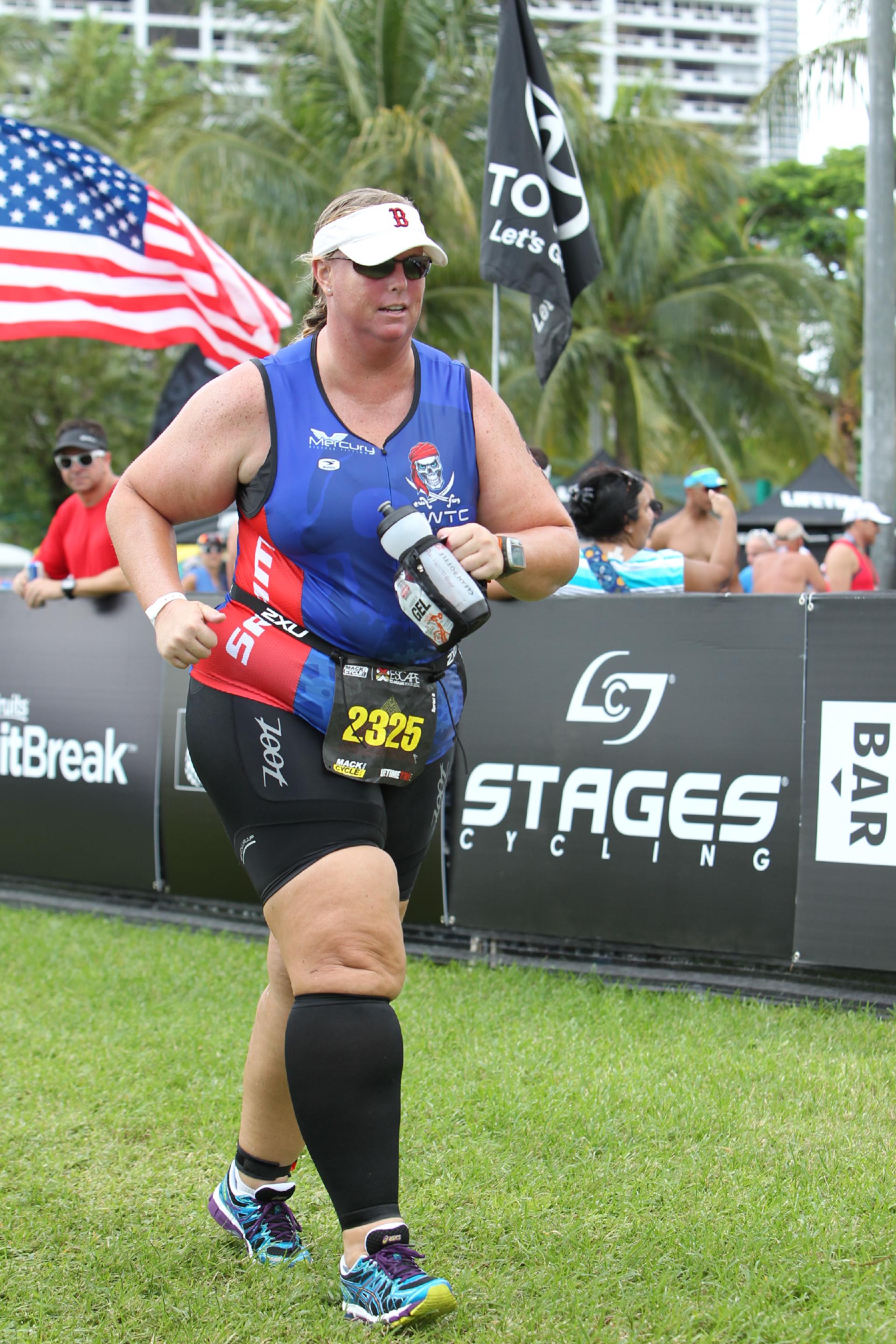 I wasn’t exactly setting a course record, but I was getting through it. On the flats I was able to pass a couple people and make sure I was taking in water and electrolytes. Weirdly, it seemed like I was always headed into the wind. I’m not sure how that is possible, but that’s what it felt like. About Mile 9 on the bike my dang back started seizing up again. What? yup. wtf. I continued on and finally saw the Bike Finish. I very gracefully (not really) dismounted. As I hobbled into T2 with my back just one knot, I heard my friend Mark say something so inspiring, encouraging and ass kicking that I was able to suck it up and get ready to run with new resolve. What was it that he said? I have absolutely no recollection. I tried to remember after the race and could not. Whatever it was, it worked!