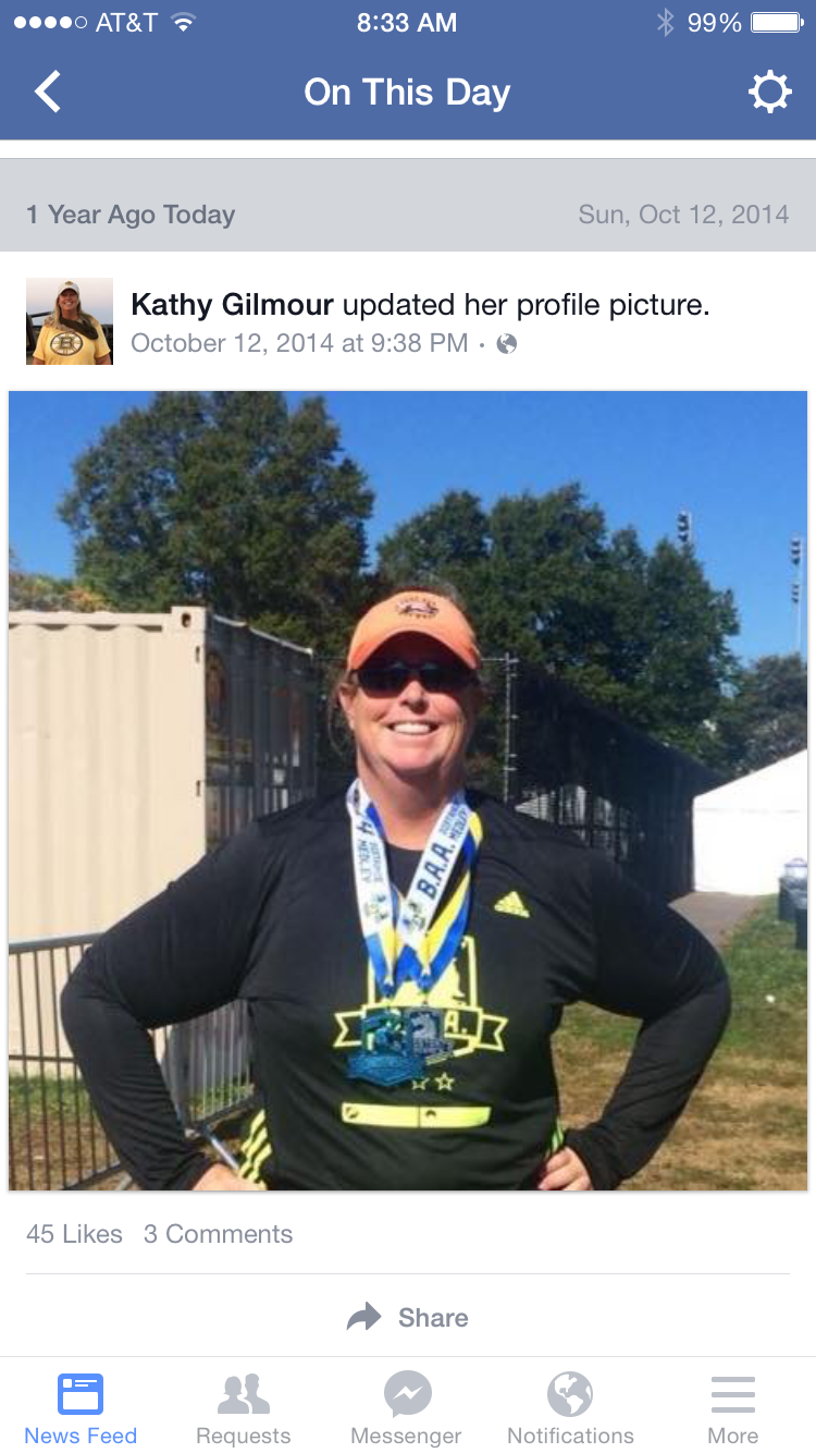 Facebook reminded me today that it was one year ago this day that I finished the BAA (Boston Athletic Association) Distance Medley. I signed up for it to force me to face the running. To get the f out there and run! It was a 5k, a 10k and a Half Marathon all spaced out nicely for training. Well, I didn’t fully run any of the races. I ran/walked them all. But I finished them!